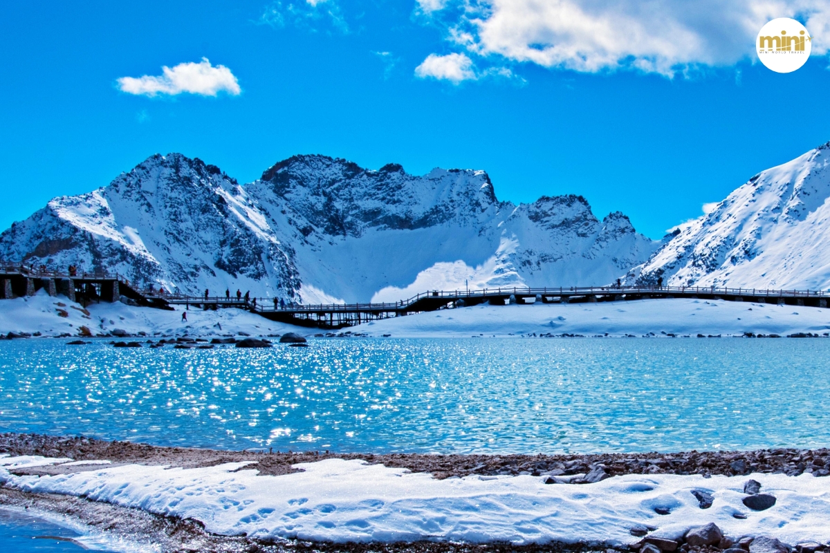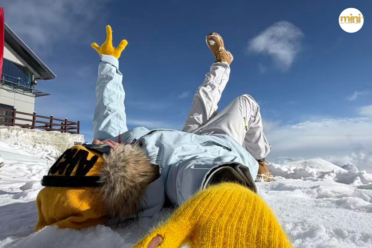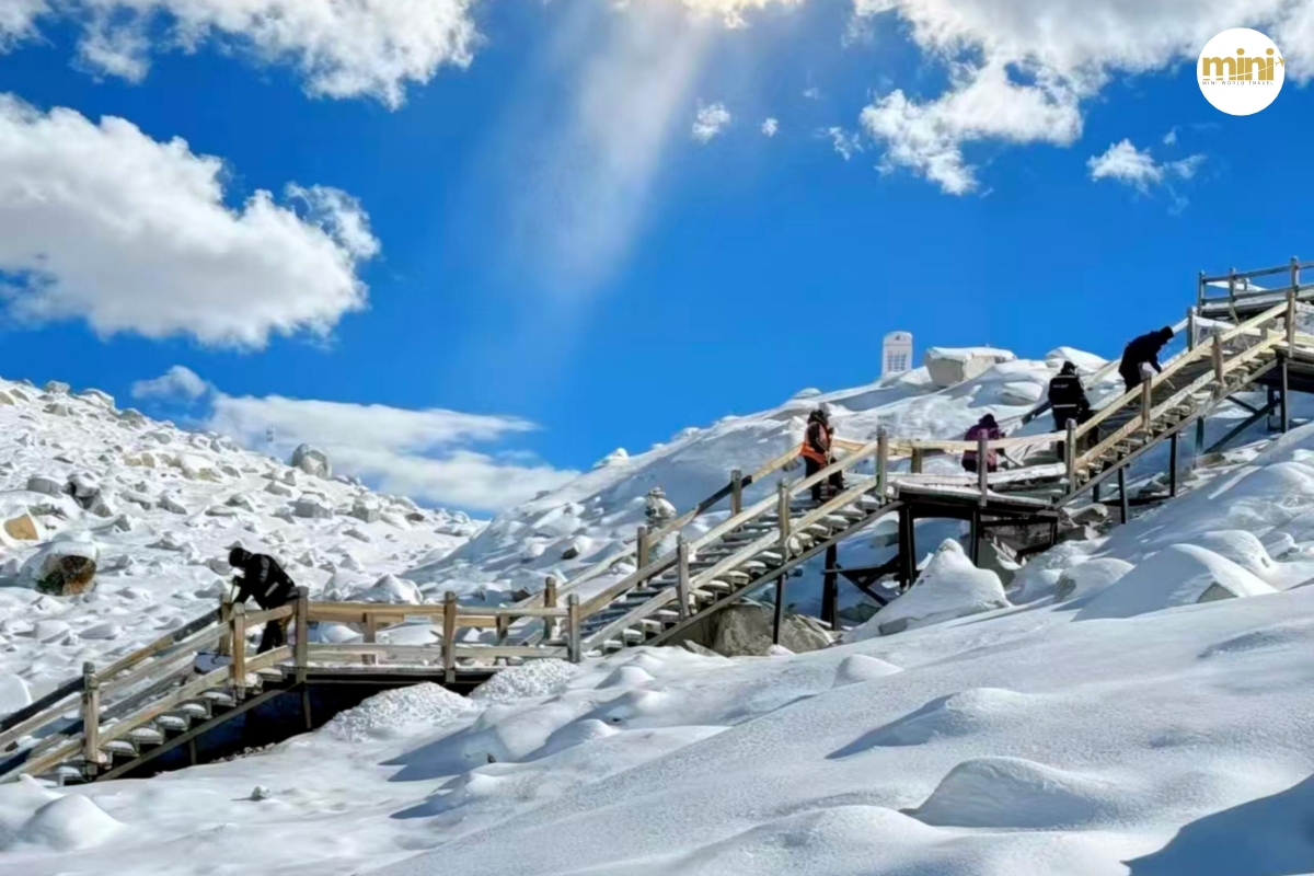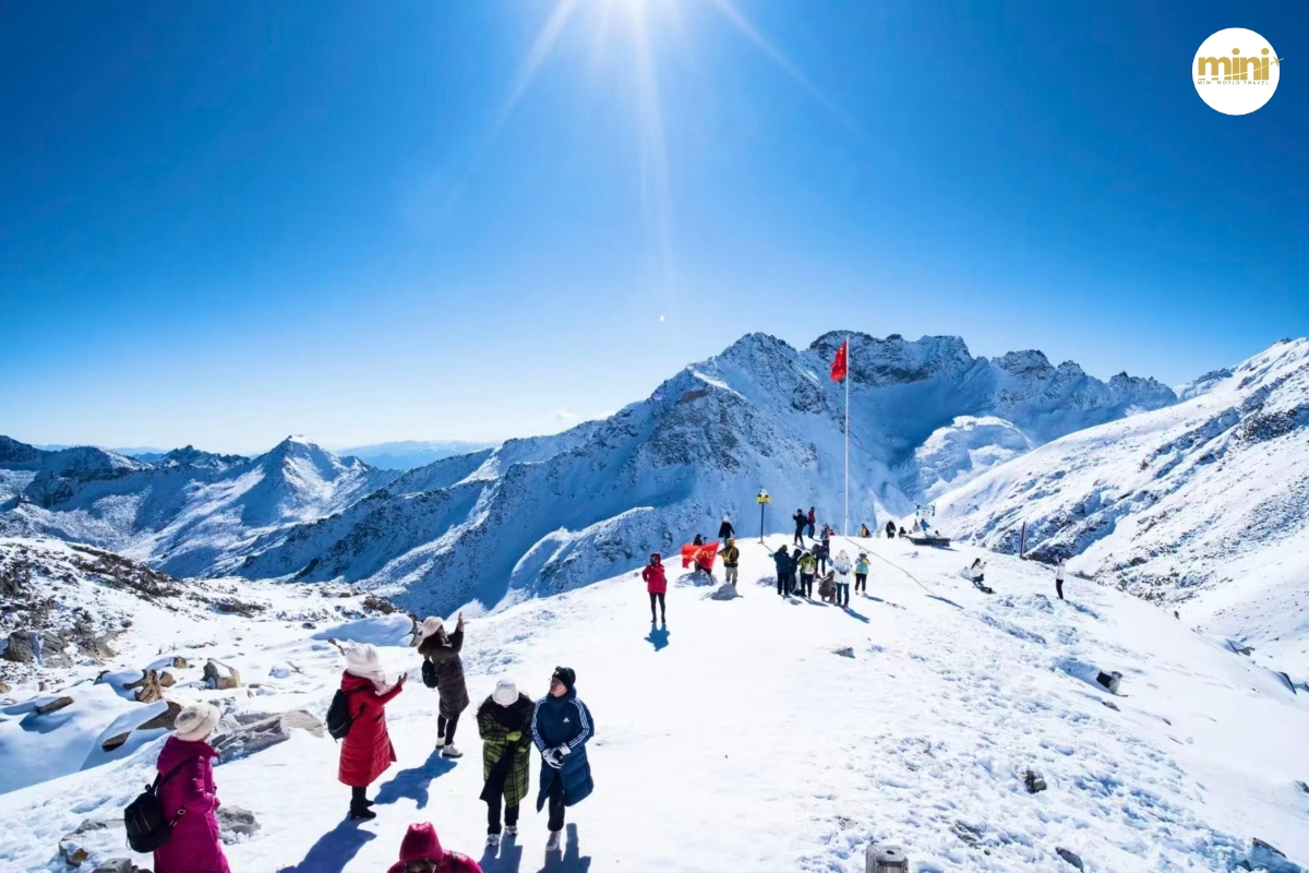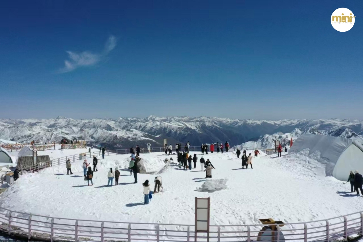เมื่อถึงด้านบน คุณจะพบกับ “โลกแห่งหิมะ” ที่แท้จริง — หิมะขาวสะอาดปกคลุมทั่วทั้งภูเขา ตัดกับท้องฟ้าสีฟ้าเข้มอย่างชัดเจน